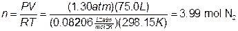 Substituting these values into our equation as shown, we calculate that we need 3.99-mol of nitrogen gas. Knowing the number of moles of N2 required, we can use the balanced equation given at the beginning of this discussion in order to determine the number of grams of NaN3 needed.