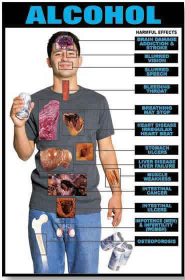 Alcohol can cause death in two manners: One by debilitating those brain areas that control consciousness, respiration and heart rate. Or two, since alcohol is a central nervous system depressant, it can literally "turn off" these vital brain areas, resulting first in coma and then death. For most people who drink too much alcohol what follows is a few hours of misery, "praying to the porcelian god". Vomiting is the body's attempt to eliminate any unabsorbed alcohol. The people who only vomit when they have consumed too much alcohol are in some strange manner the lucky ones. Some people just fall asleep (with or without vomiting) after they have consumed too much alcohol. It is these people for whom death can follow in one of two ways: One, they may fall into a deep sleep and vomit while sleeping and choke to death. Or two, they fall asleep and never wake up. This can occur when the concentration of alcohol is so high that the areas of the brain controlling life functions are so depressed that they stop altogether. |