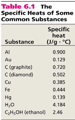 The specific heat (c) of a substance is the amount of heat (q) required to raise the temperature of one gram of the substance by one degree Celsius.