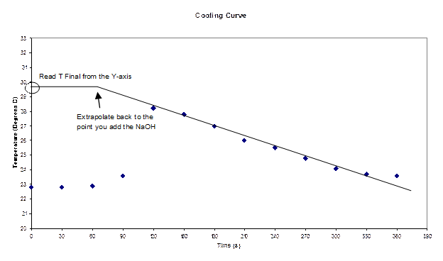 Note that this is a cooling curve, and the data of interest is on the left of the graph. The initial temperature (Ti) of the acid in the cup is 22.8°C. Temperature readings are started one minute before addition of second substance. Upon addition of NaOH, the acid temperature increases to a maximum of 28.2°C in one minute and then slowly decreases. The precise determination of Tf is more complicated, since heat exchange is occurring between the contents and the cup during and after the reaction. Evaluation of Tf is accomplished by extrapolation as shown above. This gives a theoretical temperature representing the temperature obtained if instantaneous equilibrium was achieved within the system. By extrapolation, Tf = 29.7°C. The heat capacity for the calorimeter cup is given as 6.80 J/K.