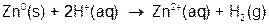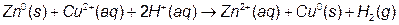 In this equation, you can see that in addition to solid copper (Cu0) being produced and solid zinc (Zn0) being ionized to aqueous Zn2+, hydrogen gas (H2) is released.