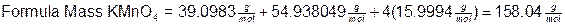 The formula mass for a compound is calculated by adding together all of the atomic masses found in the formula. For KMnO4 this is the mass of 1 potassium atom + the mass of 1 manganese atom + the mass of 4 oxygen atoms: