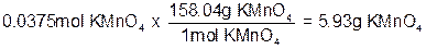 The hardest part is now done! With the number of moles of KMnO4 known, all we have to do is multiply by the molecular weight of potassium permanganate to get the number of grams.