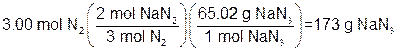 Substituting these values into our equation as shown, we calculate that we need 3.99-mol of nitrogen gas. Knowing the number of moles of N2 required, we can use the balanced equation given at the beginning of this discussion in order to determine the number of grams of NaN3 needed.