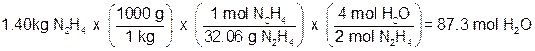 For practice, let’s look at the following example and see if we can determine which reagent is limiting and which is in excess. Let's assume we have time-warped to the early 1970s where we all are employed by NASA as rocket scientists. We are working with a fuel mixture composed of dinitrogen tetraoxide (N2O4) and hydrazine (N2H4). These two reagents react to produce nitrogen gas (N2) and water vapor (H2O), as shown below. We have been assigned to figure out which reactant is limiting when 1.40 kg of N2H4 and 2.80 kg of N2O4 are allowed to react.