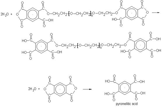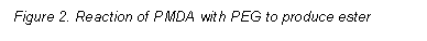 Some Specifics The ends of PEG are alcohol groups, which may be analyzed by a reaction known as esterification. In an esterification the -OH reacts with an organic acid, or, more commonly, with a more reactive derivative of the acid. In this experiment the anhydride of 1,2,4,5-benzenetetracarboxylic acid, known commonly as pyromellitic dianhydride, or PMDA for short, will be used. The reaction with PEG is shown in Fig. 2.