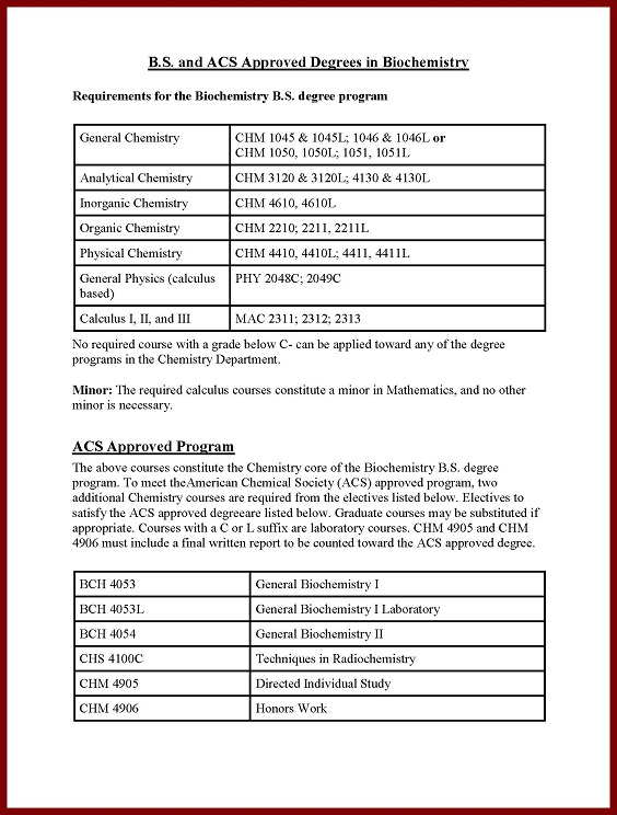 Degree Requirements FLORIDA STATE / UNDERGRADUATE / Degree Requirements For More Info:AdvisingDegree RequirementsCourse DescriptionHonorsScholarshipsAwardsResearch OpportunitiesTransfer InformationCANVASUniversity ResourcesFAQs FSU Academic Program Guides Chemistry Biochemistry Environmental Chemistry Materials Chemistry Chemical Science Chemical Science / FSU Teach