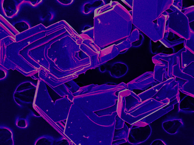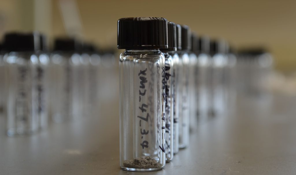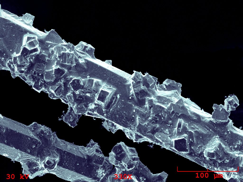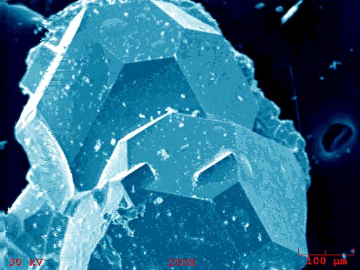 Above: Vials of samples grown from Mg/Al fluxAbove: Crystals of a new carbide grown from cerium/cobalt fluxAbove: Dendritic magnesium crystals grown by vaporization from a magnesium fluxAbove: Conversion of CoSn binary phase (large hexagonal rods) into a new Co/Zn/Sn ternary phase (cuboid growths) in Zn/Sn eutectic flux