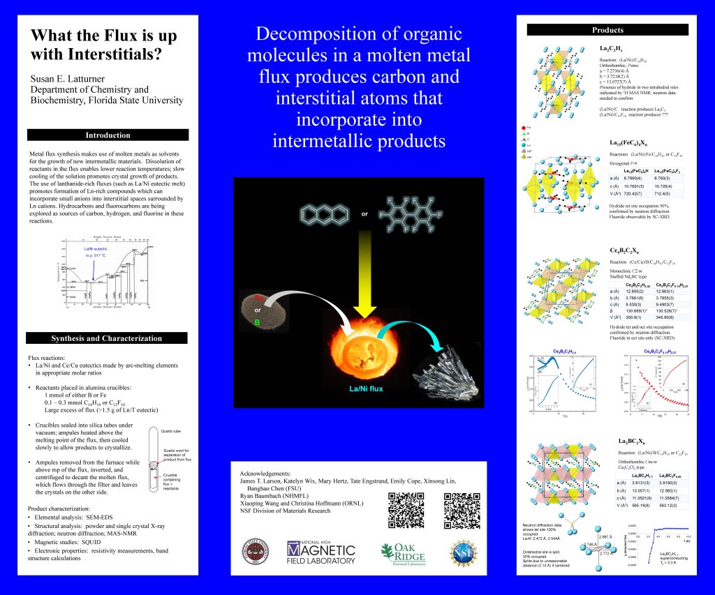 Thermal decomposition of organic molecules above a lanthanide-rich melt yields carbon and hydrogen, which are incorporated into the growing intermetallic compounds. Several new lanthanide carbide hydrides have been produced. The addition of hydride ions can lead to changes in electronic and magnetic properties. We have now expanded this method to making compounds with fluoride interstitials.