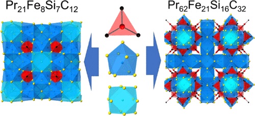 The hard magnetic materials used in computer hard drives are intermetallics such as SmCo5 and Nd2Fe14B. Their strong ferromagnetism is derived from the coupling of the local moments of the unpaired electrons on the lanthanide ion with the itinerant magnetism of the transition metal valence electrons. The binary phase diagrams of early lanthanides (Ln = La, Ce, Pr) combined with late transition metals (Ni, Fe) all feature low melting eutectics in the lanthanide-rich region which may act as fruitful synthesis media for magnetic compounds containing two paramagnetic elements. We have reported on the synthesis of new materials containing clusters and layers of iron separated by lanthanum ions from La/Ni eutectic (melting point 532 C). Even more complex phases are now being formed in reactions of metals and metalloids in Ce/Co and Pr/Co eutectic fluxes (melting points 424 and 541 C, respectively)! Structural building blocks that are commonly observed are FeC3 trigonal planar units and heavy main group atoms surrounded by 9 – 12 lanthanide ions. These building blocks can assemble different ways to yield competing products. The magnetic properties of these phases are characterized using techniques such as temperature and field dependent magnetic susceptibility measurements, Mossbauer spectroscopy, and neutron diffraction.