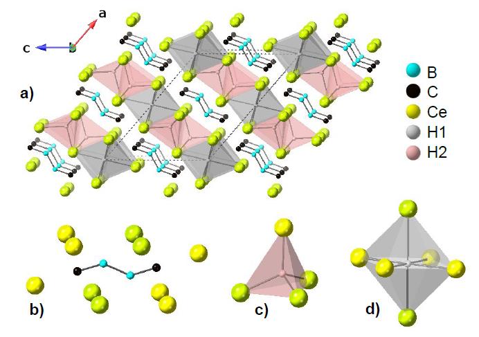 This unexpectedly hydrided phase was first grown from the reaction of carbon and boron in an excess of cerium/copper eutectic melt. The cerium likely contained some CeH2 or surface hydroxides that acted as the hydride source. Subsequent reactions using anthracene as a carbon source increased the yield of product. The structure contains borocarbide chains in addition to hydride sites in octahedral and tetrahedral interstitial sites, confirmed by neutron diffraction. This is described in our manuscript submitted to Crystal Growth and Design.