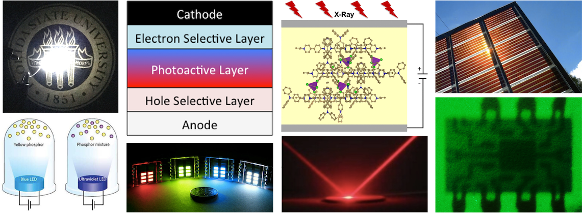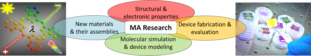 The MA Group Research focuses on the development of new functional materials with controlled chemical and physical properties for applications in a wide range of technological areas from energy to environmental and information technologies. Of particular interest are new generation electronic and energy devices, including light emitting diodes, solar cells, scintillators, sensors, and detectors. The research activities involve materials synthesis, characterization and processing, device fabrication and testing, as well as theoretical computation and simulation. Material engineering at the molecular level is emphasized to deliver a wide range of advanced functional materials, including organics, organometallics, polymers, and organic-inorganic hybrid materials, in particular metal halide perovskites and organic metal halide hybrids. Investigations on processing techniques target low cost production of high performance devices. The fundamental understandings of the structure-property-processing-performance relationships allow for the further development of materials and devices with desired properties and performance in a rational manner, which will eventually deliver new generation technologies for real applications.