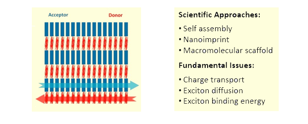 Molecules with geometry and shape in favor of intermolecular packing will be developed to obtain one-dimensional long-range order nanostructures. Besides synthetic control of molecular structure, applying external environment regulation is another powerful approach to achieving highly ordered molecular architectures. Two macromolecular scaffoldings will be applied to direct the assembly of organic semiconductors, including peptoids for two-dimensional organic sheets and dendronized polymers for one-dimensional organic semiconducting nano-objects. Applying external forces, such as thermal imprint and laser annealing, represents another interesting approach to turn disordered molecular assemblies to highly ordered ones with enhanced properties.