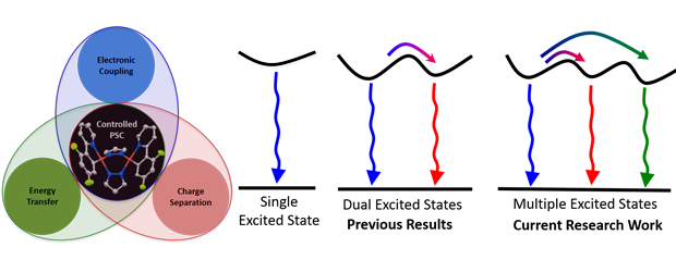 The ultimate goal of this research is to obtain the ability of designing and constructing artificial multifunctional photoactive molecular systems that can efficiently convert excitation energy to any desired forms of energy on demand, including light emission, electricity, molecular motion, and thermal energy. Currently researchers have achieved great success in developing molecular systems for a single type of task. For instance, organic light emitting diodes using heavy metal complexes as emitter can realize 100% internal quantum efficiency, so do organic solar cells based on molecular light harvester. However, synthetic photoactive molecular systems prepared to date are generally less sophisticated structurally and functionally than natural systems, due to inadequate synthetic methodology and lack of guidelines for the design of complicated molecular systems. Furthermore, multifunctional photoactive molecular systems with tunable and environmentally responsive excited state dynamics are rarely available. Thus it is of great significance to develop versatile molecular architectures that allows a systematic study of excited state dynamic processes and excited state energy flow.