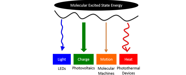 Our research involves (i) synthesis and characterization of new multicomponent molecular systems, (ii) detailed studies of the excited state dynamics by using spectroscopy tools and theoretical calculations, and (iii) exploration of potential application of these new molecules. Overall, by combining experimental and computational efforts, we aim to achieve synthetic control of the potential energy surfaces of photoactive molecular systems, as well as their excited state energy decay pathways, including radiative decay, energy transfer, charge separation, or structural change.