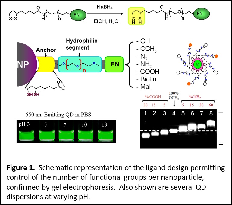 Over the past several years we have developed a few effective and versatile surface-functionalization strategies that employ, for instance, ligand exchange using modular multifunctional ligands. These designed ligands are molecular scale or oligomeric in nature and can be applied to metallic and semiconducting nanocrystals. In this design, mono- and bi-reactive tunable length polyethylene glycol (PEG) segment are appended at the end of the strong coordinating groups (namely, lipoic acid (LA)) or its reduced form, dihydrolipoic acid, DHLA). At the other end of the PEG we attach a variety of functional groups. This provides additional solubility and biocompatibility to nanoparticles cap-exchanged with such ligands. We have already demonstrated this rationale for preparing several LA- and DHLA-appended PEG ligands functionalized with azide, amine, carboxyl, alkyene, maleimide, and biotin. These ligands have provided an array of QDs and Au nanoparticles that are hydrophilic, surface reactive and stable over a broad range of biological conditions (Figure 1). (see J. Am. Chem. Soc. 2005, 127, 3870-3878. DOI: 10.1021/ja044031w; J. Am. Chem. Soc. 2007, 129, 13987-13996. DOI: 10.1021/ja0749744; J. Mater. Chem. 2008, 18, 4949-4958. DOI: 10.1039/b810488c)