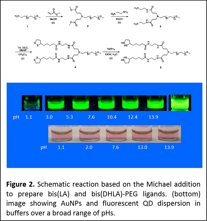 We have further expanded this design to prepare a second set of poly(ethylene glycol)(PEG)-based ligands that contain two dithiolane or two DHLA anchoring groups (i.e., bis(LA)-PEG-OCH3 and bis(DHLA)-PEG-OCH3). Here, we relied on the Michael addition to create a branch point at the end of the PEG moiety and provide bis (LA) and bis (DHLA)-appended ligands attached to a single PEG chain. These ligands provide a remarkable improvement in the colloid stability for ZnS-overcoated QDs and metal nanoparticles such as those made of Au cores, e.g., at pHs ranging from 2 to 13 compared to the nanocrystals capped with monothiol- and dithiol-terminated analogues (Figure 2). (J. Am. Chem. Soc. 2010, 132, 9804-9813. DOI: 10.1021/ja102898d)