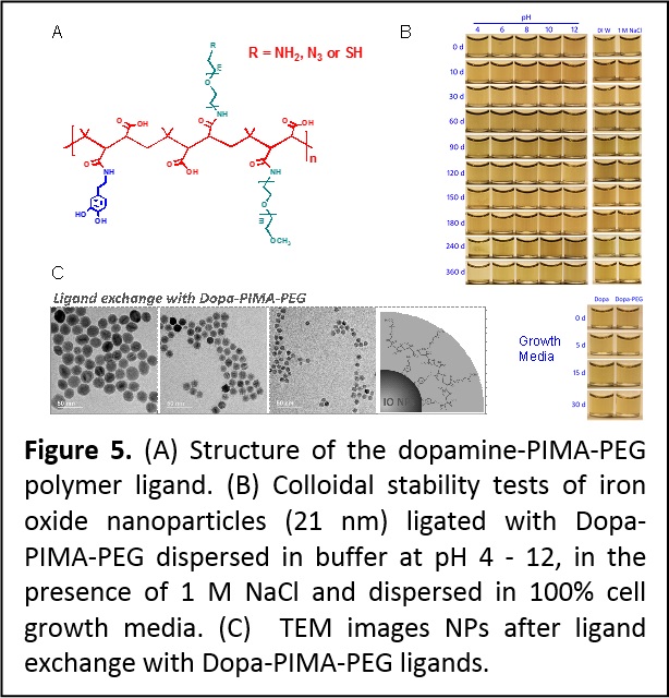 To improve the multi-catechol ligand design we explored the use of the nucleophilic addition reaction to optimize the design of a set of amphiphilic multi-coordinating polymers suited for surface-functionalizing iron oxide and potentially other magnetic nanoparticles (Figure 5). The amphiphilic polymers were prepared by coupling several amine-terminated dopamine anchoring groups, polyethylene glycol moieties and reactive groups onto a poly(isobutylene-alt-maleic anhydride) (PIMA) chain. This design greatly benefits from the highly-efficient and reagent-free one-step reaction of maleic anhydride groups with amine-containing molecules. Iron oxide nanoparticles ligand-exchanged with these polymer ligands have compact hydrodynamic size and exhibit enhanced long-term colloidal stability over the pH range 4 – 12 and in presence of excess electrolytes (Figure 5). Nanoparticles ligated with terminally reactive polymers have been easily coupled to target dyes and tested in live cell imaging with no measurable cytotoxicity. Finally, the resulting hydrophilic nanoparticles exhibit large and size-dependent r2 relaxivity values. (Langmuir 30, 6197−6208 (2014). DOI: 10.1021/la500974r)