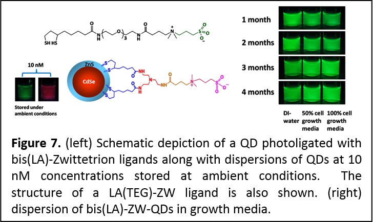 Multidentate and Zwitterionic-appended Ligands Provide Compact and Biocompatible Quantum Dots. Hydrophilic and functional semiconductor nanocrystals that are stable at very small concentrations and under ambient conditions (room temperature and light exposure) and compact provide greatly promising for use in bio-inspired applications. We designed a set of metal coordinating ligands where we combined one or two lipoic acid groups (as a multi-coordinating anchor) with a zwitterion group for water compatibility (Figure 7). These ligands were combined with the new photoligation strategy (introduced above) to promote the transfer of CdSe-ZnS QDs to buffer media. In particular, we found that the QDs photoligated with this zwitterion-terminated bis(lipoic) acid exhibit great colloidal stability over a wide range of pHs, to excess of electrolytes, in the presence of growth media and reducing agents. These QDs are also stable at nano-molar concentrations and under ambient conditions (room temperature and white light exposure), a very promising property for fluorescent labeling in biology. In addition, the compact ligands permitted the metal-histidine self-assembly between QDs photoligated with bis(LA)-ZW and two different His-tagged proteins (see area 3). The remarkable stability of these QDs combined with the compatibility with metal-histidine conjugation, are greatly useful for applications, ranging from protein tracking and ligand-receptor binding to intracellular sensing using energy transfer interactions (ACS Applied Mater. Interfaces 2013, 5, 2861−2869. DOI: 10.1021/am302788q; J. Am. Chem. Soc. 2013, 135, 13786-13795. DOI: 10.1021/ja405010v).