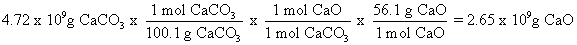 For example, number 51, page 182, which asks about converting quicklime to limestone. How much quicklime (CaO) can be made from 4.72 x 109 g of limestone (CaCO3). First we need to calculate the formula weights of these substances.