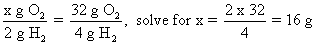 If thats the case, how much oxygen would be required to react with 4 pounds of hydrogen? (ans. 32 pounds) What about 4 grams of hydrogen? (ans. 32 grams). What about 2 grams of hydrogen? (ans. 16 grams).