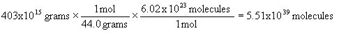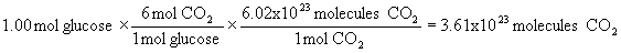 So if we look at figure 3.8 and see that photosynthesis transfers 110 billion metric tons of carbon per year from CO2 to organic matter (equivalent to carbohydrate as glucose), you should easily be able to translate that into amount of CO2 utilized and amount of glucose produced: 110 bmt C x 44.0 bmt CO2/12 bmt C = 403 bmt CO2 110 bmt C x 180 bmt glucose/12 bmt C = 1.65 x 103 bmt glucose One metric ton is 1000 kg or 106 grams. How many molecules of CO2 is consumed annually by photosynthesis? 403 billion metric tons = 403 x 109 x 106 grams