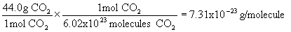 What is the mass of one molecule of CO2? Again two ways: ratio and proportion ?g /molecule CO2 = 44.0 g/6.02 x 1023 molecules CO2 ? g = 7.31 x 10-23 g. dimensional analysis