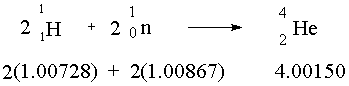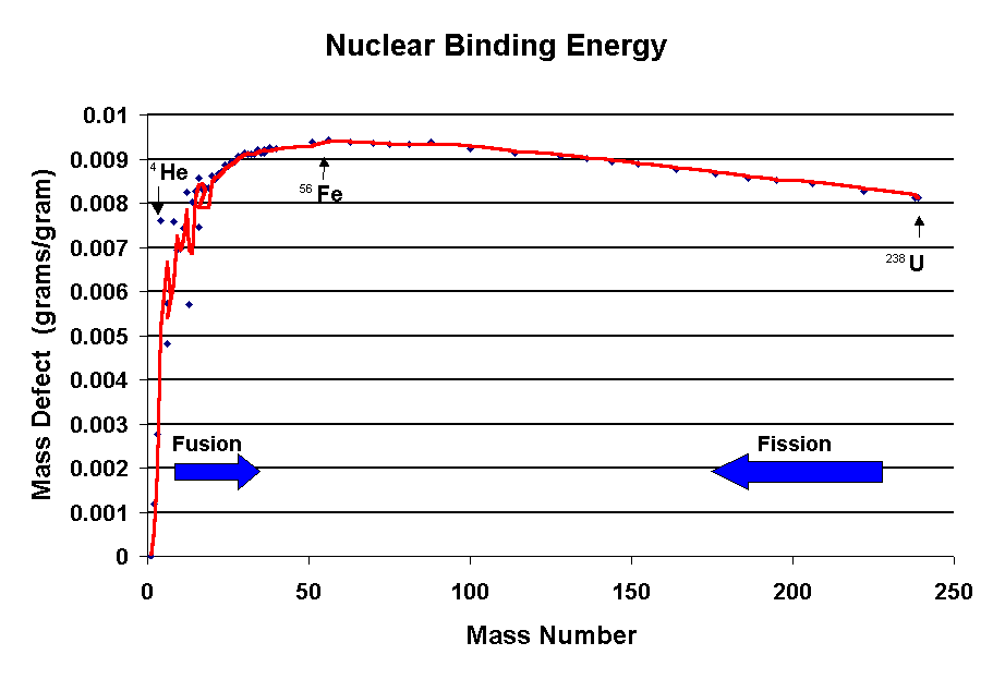 This process is accompanied by a decrease in mass of: 4.03190-4.00150 = 0.03040 amu or g/mol This lost mass is converted to the binding energy that holds the particles together in the nucleus. The relationship between the mass lost and energy produced is given by Einsteins famous equations: E = mc2 where m is expressed in kg and c is the velocity of light (3.00x108 m/s). To compare the size of the binding energies from one atom to the next, one should express the amount of mass lost as the change in mass per nucleon (per proton and neutron). In this case, that change is 0.03040/4 = .0076 g/mol of nucleons. This mass loss corresponds to an energy change calculated as follows: E = 0.0076 g/mol x 10-3 kg/g (3.00 x 108 m/s)2 = 6.84 x 1011 kg-m2/s2 (or Joules) = 6.84 x 108 kJ per mole of nucleon. This loss of mass is called the mass defect. The energy is the binding energy of the particles in the nucleus; i.e. it would take this much energy to break the particles apart. If we plot the mass defect (i.e. the loss of mass per gram of nucleon) for each of the elements, we get the following curve: