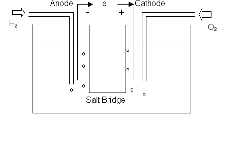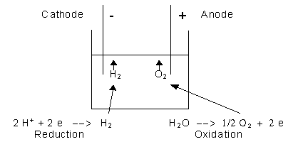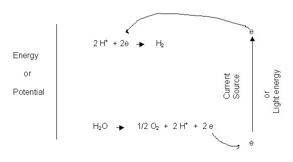 In photosynthesis, the energy level of the electrons are raised by means of photons of light being absorbed by the pigment chlorophyll, promoting them to a higher energy level so that they can be passed on to substances which ultimately could reduce hydrogen or some other difficult to reduce substance. The removal of that electron produces a very strong oxidant that is capable of removing electrons from water. The energy comes from light, however, rather than an electrical generator. Your text describes a molecule that could act somewhat in the fashion of chlorophyll in plants. It is a derivative of Ruthenium that is capable of absorbing light and causing an electron to be promoted from the Ru metal to the bispyridine portion surrounding the metal. The electron so promoted is in a higher energy state and would be capable of reducing a water molecule to form hydrogen: 2 H2O + 2 e --> 2 OH- + H2 while the oxidized form of the complex should be capable of oxidizing water to form oxygen: 4 H2O --> 4 H+ + O2 + 4 e Note, though, that each process must be a multi-step process with presumed intermediates. In photosynthesis, the process of oxidizing water takes place on a complex between manganese ions complexed with several water molecules so that one electron can be removed at a time. The hope is to develop some kind of artificial substance that can behave as the chlorophyll and the manganese complex and harness several photons of light to carry out this process. We have yet to achieve that goal. What if we could? Then we could consider the use of the hydrogen produced as a fuel. Hydrogen has many desirable properties: There are no polluting byproducts in its reaction with oxygen, and no greenhouse gas formed. The problem comes in the transport and storage, since hydrogen is a gas and is very flammable. It is possible to react hydrogen with oxygen in an indirect way in what is called a fuel cell rather than in an explosive reaction. The fuel cell is in some sense just the reverse of the electrolytic cell described above, except that the electrodes are separated into different compartments, or half-cells, which are connected by a salt bridge. Compare the following with Figure 9.6 of your text: