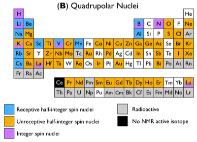 Here is a similar periodic table for quadrupolar nuclei (i.e., nuclear spins > 1/2). Note, that all integer-spin nuclei are considered to be unreceptive.