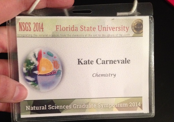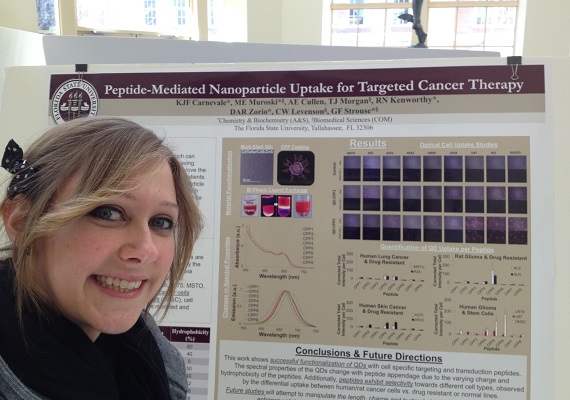 Kate presented her work on "Nano-biosensor: Probing Intracellular Response to Nanoparticle Delivery" at the 2014 Natural Sciences Graduate Research Symposium held at the Oglesby Union at FSU.