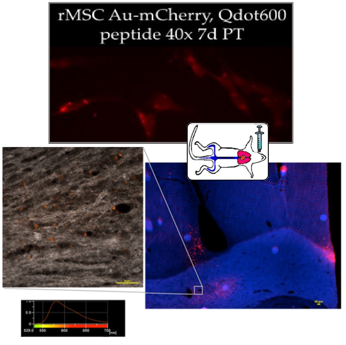 Developing nanotechnology to transform a primary cell into a stable bio-reactor of a desirable protein for enhanced therapeutic effects to track and improve outcomes in brain injuries (TBI, stroke). This collaborative project with the College of Medicine and Bio-medical Engineering has developed nanoparticle-driven stem cell delivery systems that are versatile enough to permit us to reliably regulate the expression of a host of genes in a controlled and traceable fashion. The effort may be applied to a wide variety of pre-clinical disease models with the ultimately goal of clinical testing and application. The images below show transfected cells (in vitro-left) and in brain slices with spectral conformation (in vivo-right). The image at the bottom is from a Stroke model that show spectral conformation of FeOx nanoparticles appended with flourescent proteins in the brain after a stroke.